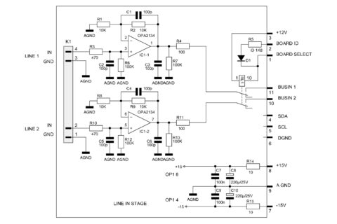 The output stage boards can be configured as pre-out or rec-out. In pre-out configuration the output signal is controlled by the volume control and in rec-out the selected input is amplified and send out to the output of the board.